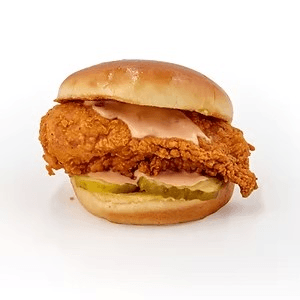 Pickles and zinger sauce on a toasted brioche bun. Mild